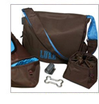 It sports a bone shaped carabineer, pocket for waste bags, indoor/outdoor blankie, freezable gel pack, food and water bowls, and 8 inside pockets for anything and everything from vet records, hand wipes, cell phone (yours not Fido’s), pen, MP3 and more.